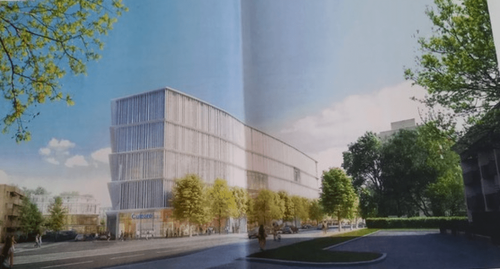 Les arbres au fond sont représentés beaucoup plus grands, et l’immeuble d’habitation « L’Orée de France » derrière est représenté plus élevé que l’édifice, alors que celui-ci aura 32 m de hauteur.